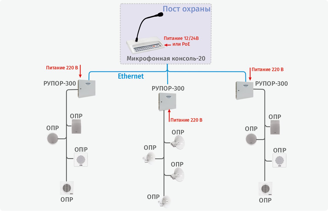 Ядром технического решения является блок речевого оповещения «Рупор-300», который имеет возможность подключения высокоомных речевых оповещателей, рассчитанных на напряжение 100 В. Максимальная суммарная мощность подключаемых речевых оповещателей составляет 300 Вт. Внутренняя память блока рассчитана на хранение 255 сообщений общей продолжительностью 400 с. Блок воспроизводит речевые сообщения согласно их приоритетам, при необходимости прерывая одно оповещение другим, более приоритетным. Тем самым обеспечивается возможность корректировки порядка эвакуации. Доступны программирование и изменение ряда параметров: пауз между речевыми сообщениями, преамбулы речевого оповещения (звукового сигнала для привлечения внимания), текстов речевых сообщений. В блоках «Рупор-300» реализован инновационный подход к построению линий оповещения, и они могут иметь произвольную топологию: «шина», «дерево» или «звезда». В линии оповещения могут включаться любые речевые оповещатели, рассчитанные на напряжение 100 В, при этом рекомендованы прошедшие всестороннее тестирование речевые оповещатели серии «ОПР» компании «Болид». Это настенные оповещатели ОПР-С103.1, ОПР-С106.1, ОПРС120.1, потолочные оповещатели ОПР-П103.1 и ОПР-П110.1, всепогодный оповещатель колонного типа ОПР-У110.1, всепогодные рупорные оповещатели ОПР-У150.1, ОПРУ130 – от 3 до 50 Вт мощности.