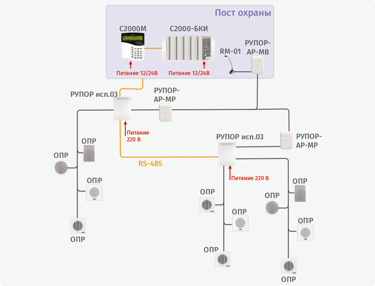 Поэтому в данном решении нельзя использовать микрофонную консоль, а ее эквивалентом будет совокупность пульта «С2000M» или «С2000М исп.02», блока контроля и индикации С2000-БКИ, микрофона RM-01 с модулями «Рупор-АР-МВ», «Рупор-АР-МР». В этой связке активация сценариев оповещения выполняется посредством 60 кнопок на «С2000-БКИ», а аналоговый сигнал от микрофона передается по двухпроводной линии в блоки речевого оповещения через модули «Рупор-АР-МВ», «Рупор-АР-МР». «Рупор исп. 03» предназначен для трансляции предварительно записанной речевой информации, имеет один канал оповещения мощностью 40 Вт, рассчитанный на подключение низкоомных акустических модулей. Функционал «Рупор исп. 03» позволяет программно ограничивать уровень максимальной мощности для согласования линии с расчетным количеством речевых оповещателей. В память прибора можно записать до 255 различных сообщений общей продолжительностью до 84 с. Блок поддерживает настройку таких параметров, как задержка оповещения, пауза между речевыми сообщениями, преамбулы речевого сообщения, время оповещения, приоритеты оповещения для сообщений. Помимо этого, «Рупор исп. 03» поддерживает подключение до 16 блоков расширения «Рупор-БР» для ретрансляции речевой информации с мощностью оповещения до 40 Вт.