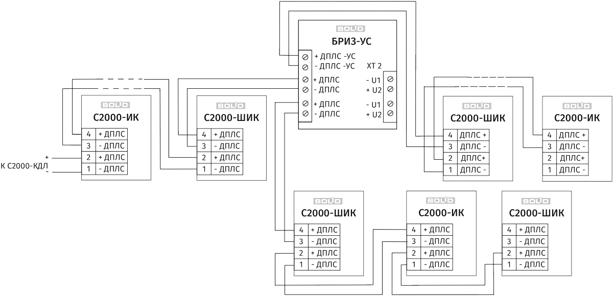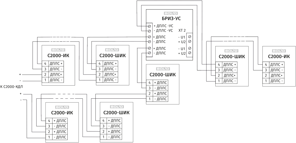 Для обеспечения дополнительного тока нагрузки в ДПЛС и увеличения максимальной длины ДПЛС применяются блоки разветвительно-изолирующие с усилителями сигнала «БРИЗ-УС». Они имеют три защищенных друг от друга изоляторами КЗ порта адресной линии: два для включения в кольцо и один для организации ответвления. Усиленное ответвление будет фактически являться новой линией ДПЛС, по которой можно будет запитать АУ суммарным током 64 мА (максимальный ток – не более 84 мА), и длина которой будет аналогична длине ДПЛС блока «С2000-КДЛ». Всего в кольцо можно включать до 8 блоков «БРИЗ-УС». «БРИЗ-УС» требует внешнее питание 12 / 24 В.
