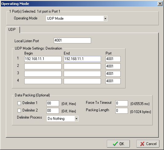 Примечание: заданный адрес 192.168.11.255 – широковещательный адрес для сети 192.168.11. Если используется другая адресация в сети, то необходимо ввести адрес используемой Ethernet сети и в качестве узла задать 255. Если количество удаленных точек не более 2-3, для локализации трафика возможно указывать IP-адреса удаленных Nport’ов.