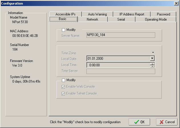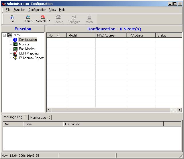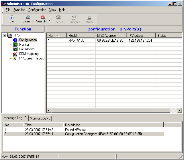 Конфигурация NPORT’ов (режим работы, настройки серийного порта, IP адрес) осуществляется по ЛВС с помощью специальной программы «NPort Administrator», входящей в состав ПО.