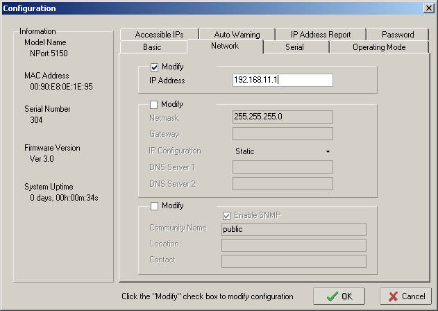 После чего необходимо перейти на вкладку «Network» и настроить IP адрес. Для этого необходимо отметить флаг «Modify» и ввести значение адреса в поле «IP Address».