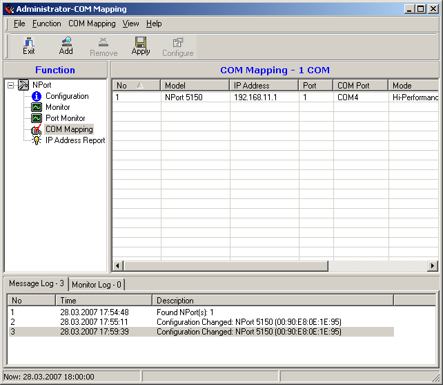 После чего выбрать в списке «Function» параметр «COM Mapping» и нажать на кнопку «Add». В появившемся окне необходимо выбрать Nport 5150 и нажать кнопку «OK». В результате в списке «COM Mapping» появится новая запись с информацией о подключенном устройстве: