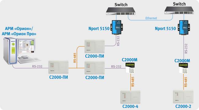 4. Сетевой контроллер АРМ «Орион»/АРМ «Орион Про» подключается к С2000-ПИ, далее два С2000-ПИ. Первый к пульту C2000М, на выходе RS-485 к приборам. Второй к NPort 5150, далее в Ethernet, потом NPort 5150, на выходе RS-232 к пульту C2000М, на выходе RS-485 далее к приборам.