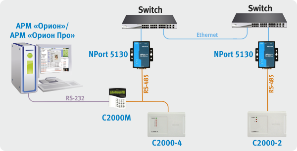 2. Сетевой контроллер АРМ «Орион»/АРМ «Орион Про» подключается к пульту C2000М, один луч RS-485 к приборам, а другой к NPort 5130, далее в Ethernet, потом NPort 5130 на выходе RS-485 далее приборы.