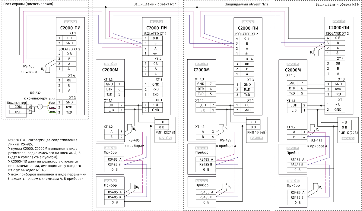 Недостатком такой схемы является отсутствие гальванической изоляции между приборами и компьютером. Схема подключения пульта к компьютеру с использованием повторителя интерфейсов «С2000-ПИ», обеспечивающего гальваническую изоляцию, приведена на рис.
