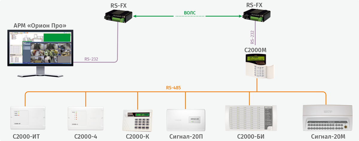 Ещё одним вариантом подключения пульта «С2000М» к компьютеру с АРМ является использование волоконно-оптической линии связи и преобразователей «RS-FX-MM» (для многомодовых ВОЛС), «RS-FX-SM40» (для одномодовых ВОЛС).
