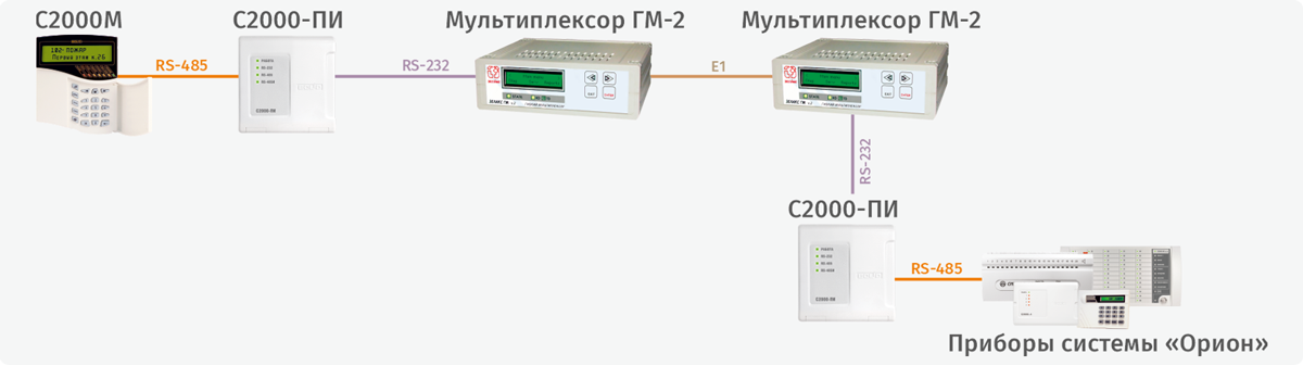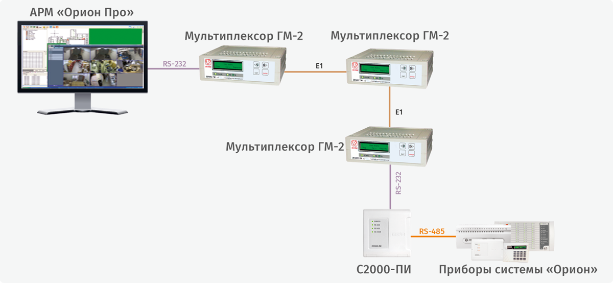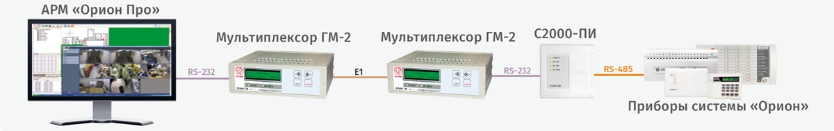Специалистами компании «Болид» была проверена работа системы «Орион» с применением мультиплексоров «ГМ-2» фирмы «Зелакс» для передачи сообщений по цифровому каналу связи в потоке Е1 (рис. ниже).
