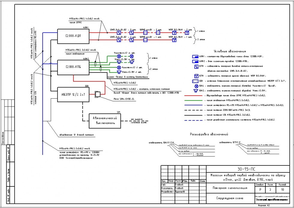 Пожарная сигнализация в магазине товаров первой необходимости смонтирована по проекту "30-15-ПС" на основе адресно-аналоговой подсистеме «С2000-КДЛ». Контроль состояния и управление системой производится с центрального поста охраны. Система пожарная сигнализация формирует управляющие и информационные сигналы в систему вентиляции.