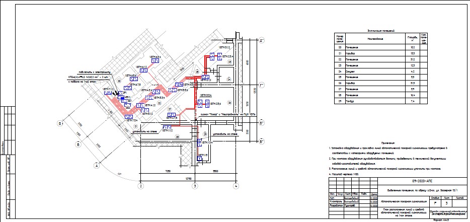 Система пожарная сигнализация в выделенных помещениях 1-го этажа и подвала запроектирована на приборе приёмно-контрольный охранно-пожарный "Сигнал-20М".