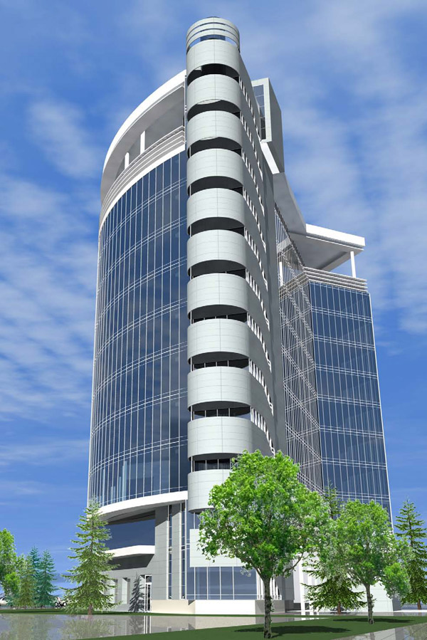 здание десятиэтажное, с подвалом, но без технического этажа, Г-образной волновой формы с линейными размерами по сторонам 65,400х57,300 м, общей площадью 17000 м2;