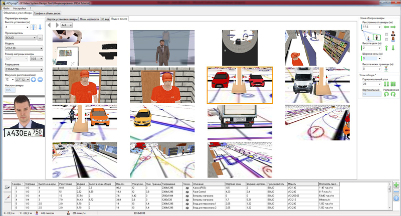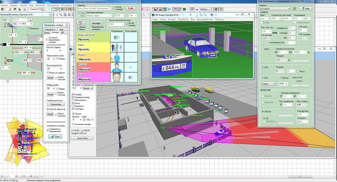 • Работа с 2D проекциями (отображение на 2D планировке результатов расчетов; моделирование влияния дисторсии объектива на форму зоны обзора и её проекций и на распределение пространственного разрешения)