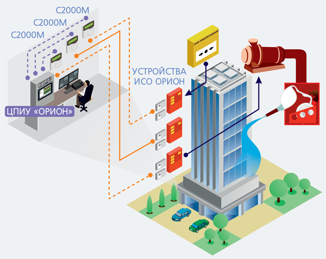 Например, связь сигналов о пожаре в одной зоне объекта с исполнительными устройствами пожаротушения или оповещения в другой зоне. Таким образом, при изменении состояния входов устройств, подключенных к одному пульту "С2000М", возможно управление выходами блоков, контролируемых другим пультом "С2000М". Ранее эта задача решалась только на аппаратном уровне с помощью релейных выходов и контролируемых входов. Теперь весь информационный обмен осуществляется на уровне программного обеспечения ЦПИУ "Орион", на основе общей базы данных, объединившей устройства всех локальных систем. При этом во всей полноте можно использовать классический механизм сценариев управления ИСО "Орион". В итоге ЦПИУ "Орион" позволяет в автоматическом режиме управлять элементами систем дымоудаления, оповещения и эвакуации, включая разблокировку эвакуационных выходов, а также системами тушения и другим инженерным оборудованием. ЦПИУ "Орион" и все пульты "С2000М" традиционно можно разместить в общем помещении поста с круглосуточным пребыванием персонала, при этом пульты подключаются к четырём встроенным СОМ-портам ЦПИУ "Орион" напрямую или через преобразователи интерфейсов.