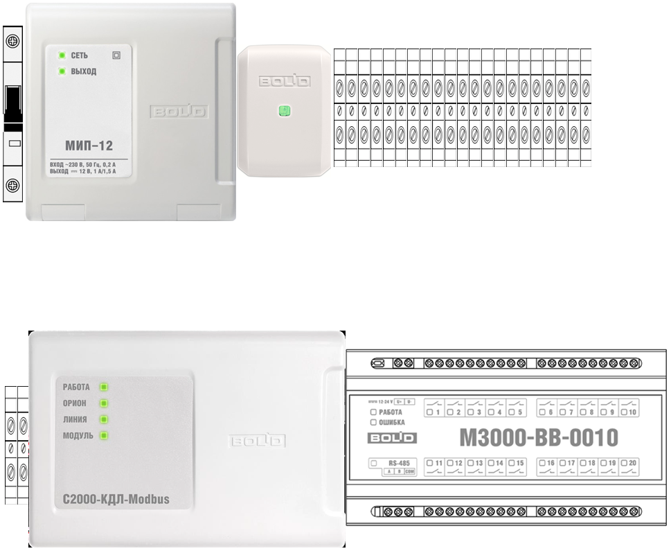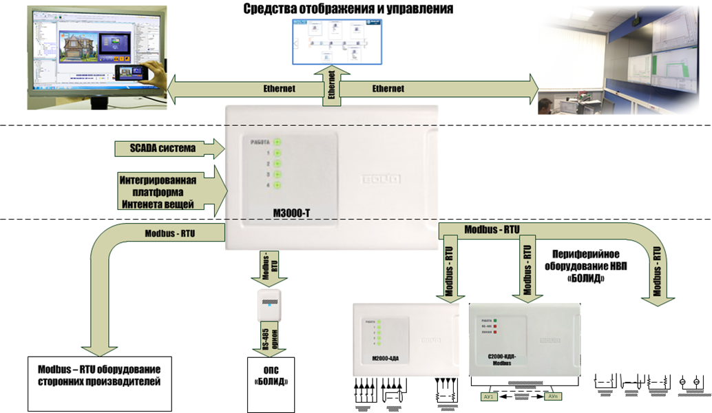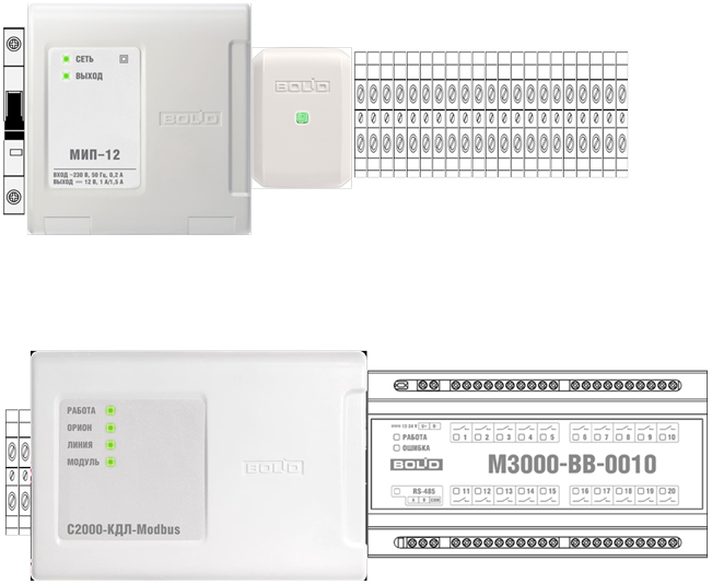 • возможность использования в качестве периферийного оборудования любого ModBus-RTU оборудования, а также оборудования ранее установленных на объектах систем ОПС НВП "Болид";