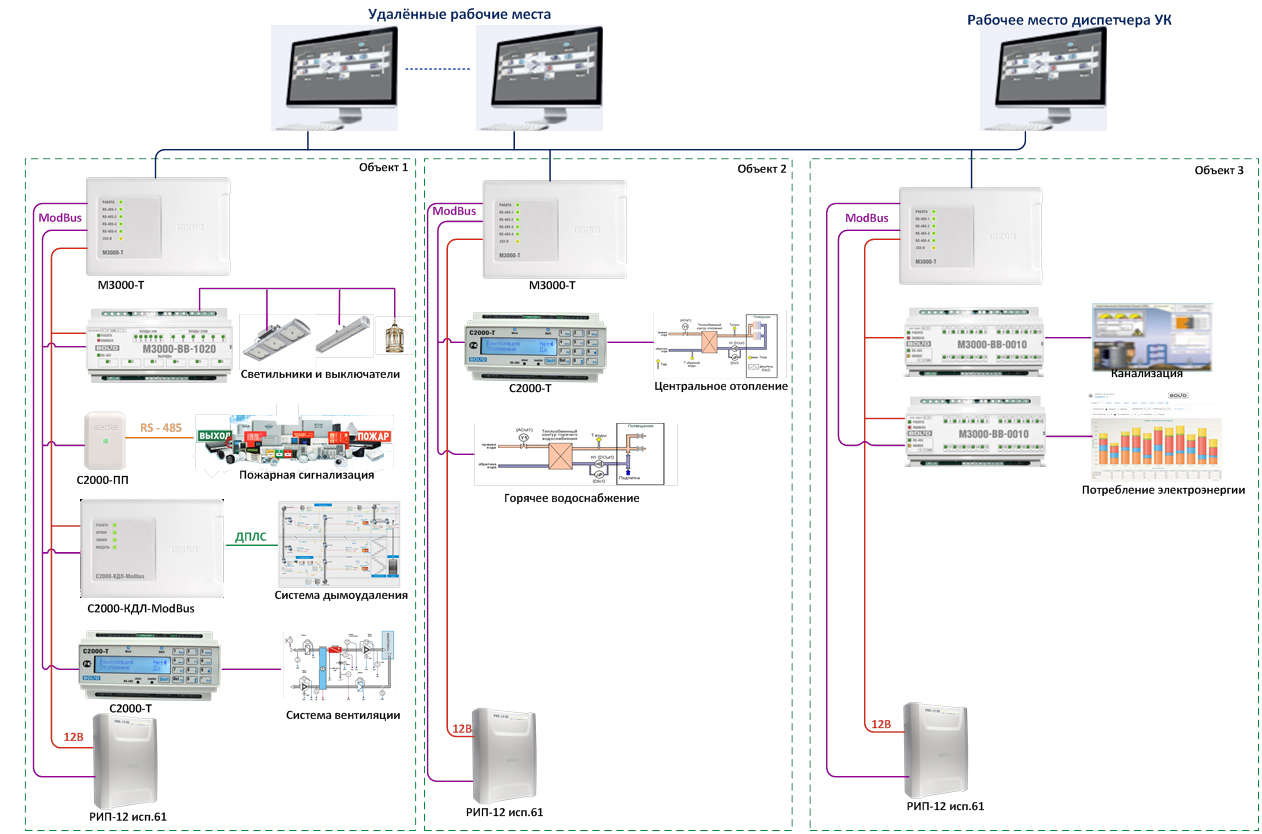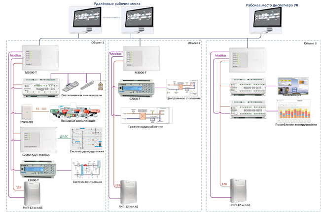 В данном случае контроллеры М3000-Т обрабатывают информацию, поступающую с оборудования подключённых к ним объектов. Сеть Ethernet в данном случае понимается в широком смысле как среда, т.е. контроллеры М3000-Т могут располагаться в разных точках этой среды, включая удалённые подключения, а также рабочие места могут быть как локальными, так и удалёнными в зависимости от решаемой задачи. При использовании контроллером М3000-Т SCADA системы Master SCADA-4D компании Инсат для отображения на рабочих местах могут использоваться любые интернет браузеры (кроме Internet Explorer).