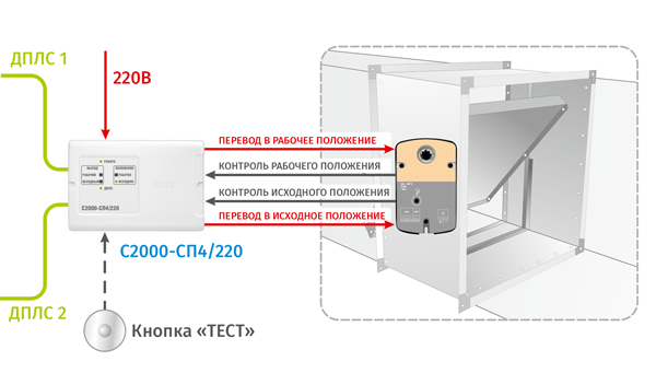 Традиционно для управления реверсивными клапанами дымоудаления в адресной автоматики СПДВ ИСО «Орион» наиболее часто используются блоки ввода-вывода типа С2000-СП4/220. Они занимают в адресном пространстве системы 5 адресов, и подключаются к приводу по схеме, приведенной на рис.1.