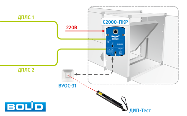 Привод подключается непосредственно в двухпроводную линию связи (ДПЛС) контроллеров С2000-КДЛ, принимает команды от С2000-КДЛ, контролирует положение заслонки клапана, отправляет в систему автоматики информацию о его состоянии (рис.3). Подключаемое к модулю выносное устройство индикации ВУОС-31 позволяет с помощью лазерного тестера посылать в привод телеметрические команды на активацию привода для проверки работоспособности.