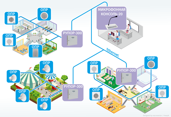 Ядром технического решения является блок речевого оповещения «Рупор-300», который имеет возможность подключения высокоомных речевых оповещателей, рассчитанных на напряжение 100 В. Максимальная суммарная мощность подключаемых речевых оповещателей составляет 300 Вт. Внутренняя память блока рассчитана на хранение 255 сообщений общей продолжительностью 400 секунд. Блок воспроизводит речевые сообщения согласно их приоритетам, при необходимости обеспечивая прерывание одного оповещения другим, более приоритетным. Тем самым обеспечивается возможность корректировки порядка эвакуации. Также доступна возможность программирования и изменения ряда параметров: пауз между речевыми сообщениями, преамбулы речевого оповещения (звукового сигнала для привлечения внимания), текстов речевых сообщений.
