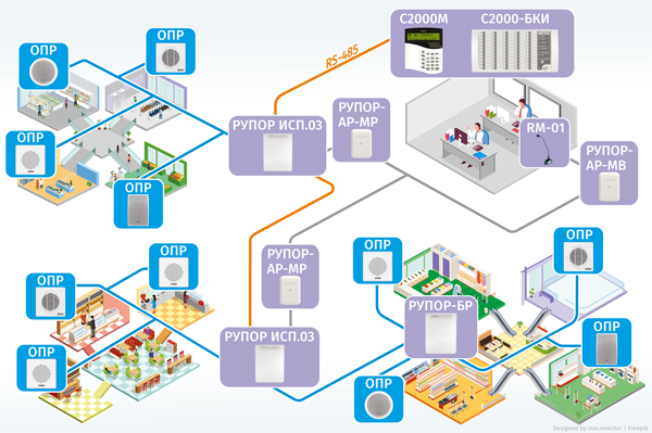 Поэтому в данном решении нельзя использовать микрофонную консоль, а ее эквивалентом будет совокупность пульта С2000M, блока контроля и индикации С2000-БКИ, микрофона RM-01 с модулями «Рупор-АР-МВ», «Рупор-АР-МР». В этой связке активация зон оповещения выполняется посредством 60 кнопок на С2000-БКИ, логически связанных в пульте С2000М с помощью сценариев управления, а аналоговый сигнал от микрофона передается по двухпроводной линии в блоки речевого оповещения через модули «Рупор-АР-МВ», «Рупор-АР-МР». «Рупор исп.03» предназначен для трансляции предварительно записанной речевой информации, имеет один канал оповещения мощностью 40 Вт, рассчитанный на подключение низкоомных акустических модулей. Функционал «Рупор исп.03» позволяет программно ограничивать уровень максимальной мощности, для согласования линии с расчетным количеством речевых оповещателей. В память прибора можно записать до 255 различных сообщений общей продолжительностью до 84 секунд. Блок поддерживает настройку таких параметров как: задержка оповещения, пауза между речевыми сообщениями, преамбулы речевого сообщения, время оповещения, приоритеты оповещения для сообщений. Также «Рупор исп.03» поддерживает подключение до 16 блоков расширения «Рупор-БР» для ретрансляции речевой информации с мощностью оповещения до 40 Вт. Питание «Рупор исп.03» «Рупор-БР» осуществляется от сети 220 В, и имеется возможность установки АКБ 7 или 9 А*ч в качестве резервного источника.