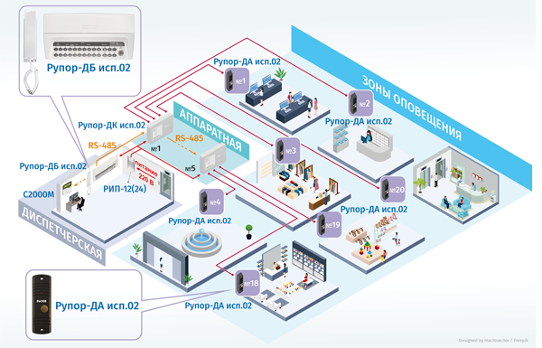 Для решения этой задачи компанией Болид производится комплекс технических средств «Рупор-Диспетчер исп.02», который состоит из 3 изделий: блока «Рупор-ДБ исп.02» (диспетчерский блок с трубкой диспетчера), блока «Рупор-ДК исп.02» (коммутационный блок) и модуля «Рупор-ДА исп.02» (абонентская вызывная панель). Топология построения СДС и связи между компонентами комплекса отражены на Рис.3.