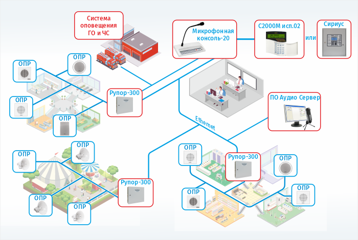 В рамках одной системы оповещения одновременно могут использоваться несколько консолей с различными приоритетами для организации пожарных постов, рабочих мест секретарей, стоек информации (рис.2). Передача информации от консоли к «Рупор-300» осуществляется по сети Ethernet. Один блок «Рупор-300» может быть включен в несколько зон. В одну зону может быть добавлено до 100 блоков «Рупор-300», а во всех зонах одной консоли может быть до 500 блоков.