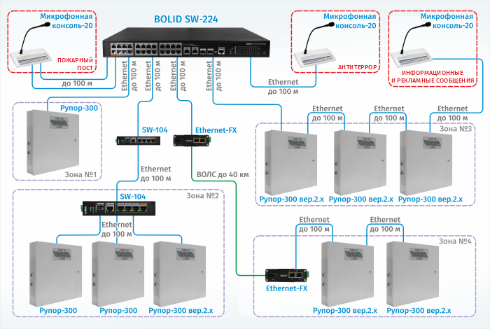 Отдельного внимания заслуживает вопрос организации локальной сети Ethernet для связи блока «Микрофонная консоль-20» и блоков речевого оповещения «Рупор-300». Очевидно, что все компоненты должны быть сертифицированы для применения в качестве средств обеспечения пожарной безопасности.