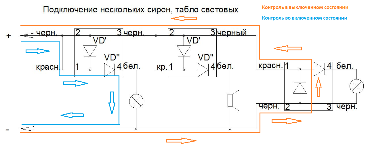 При таком включении в дежурном режиме контролируется общая соединительная цепь на всем ее протяжении. Сирены (табло) должны подключаться по топологии «шина» (от сирены к сирене). Ответвления не допускаются. Подключение должно осуществляться методом пайки, применение монтажных, разветвительных коробок не допустимо, т.к. после первой монтажной коробки будет отсутствовать контроль линии на обрыв. Количество сирен (табло) определяется номинальным коммутируемым током по пусковому выходу (см. в руководстве по эксплуатации на выбранный из списка прибор). Таким образом, Вы сами можете рассчитать это количество, зная параметры одной сирены (табло).